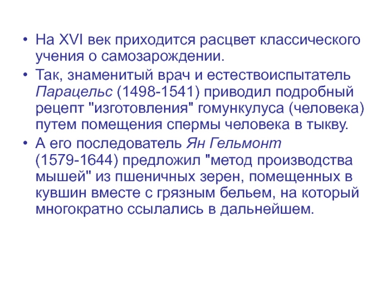 Слайд 9На ХVI век приходится расцвет классического учения о самозарождении.
