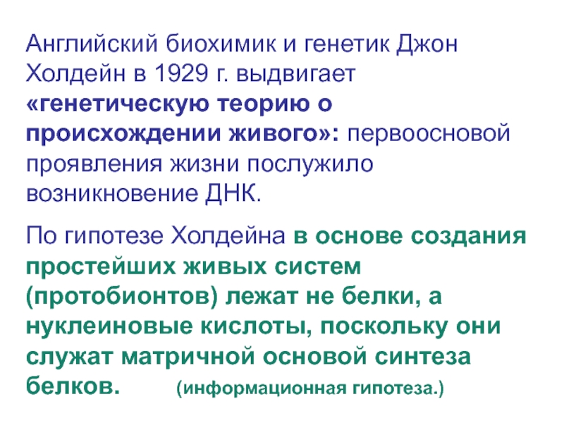 По гипотезе Холдейна в основе создания простейших живых систем (протобионтов) лежат не белки, а нуклеиновые кислоты, поскольку они служат матричной основой синтеза белков. (информационная гипотеза.)