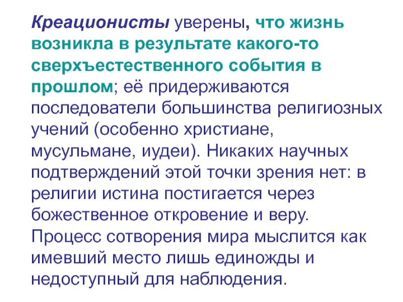 Слайд 3Креационисты уверены, что жизнь возникла в результате какого-то сверхъестественного события