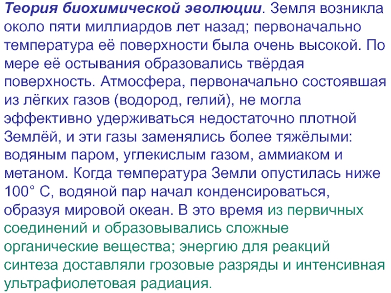 Слайд 13Теория биохимической эволюции. Земля возникла около пяти миллиардов лет назад;