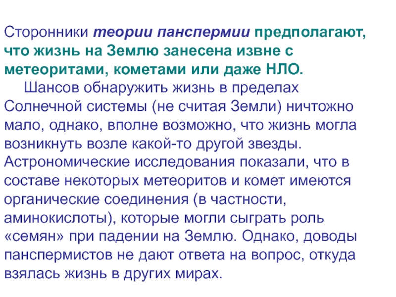 пределах Солнечной системы (не считая Земли) ничтожно мало, однако, вполне возможно, что жизнь могла возникнуть возле какой-то другой звезды. Астрономические исследования показали, что в составе некоторых метеоритов и комет имеются органические соединения (в частности, аминокислоты), которые могли сыграть роль «семян» при падении на Землю. Однако, доводы панспермистов не дают ответа на вопрос, откуда взялась жизнь в других мирах.