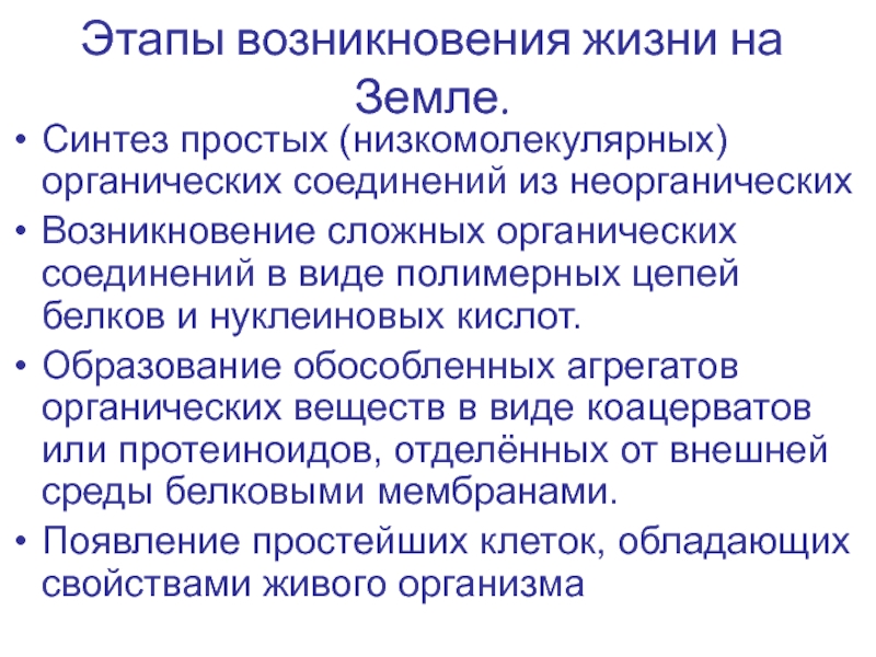 Возникновение сложных органических соединений в виде полимерных цепей белков и
