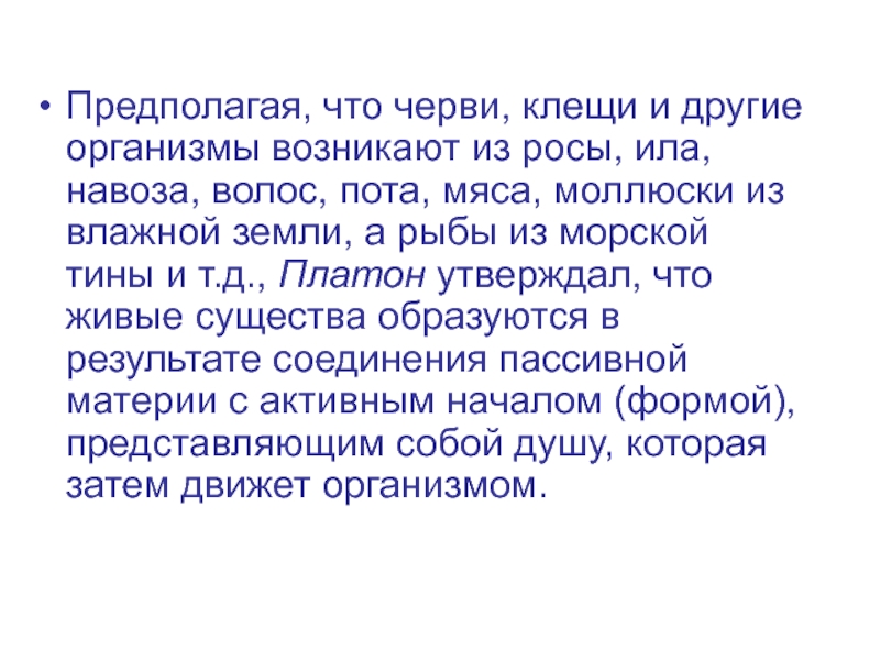 рыбы из морской тины и т.д., Платон утверждал, что живые существа образуются в результате соединения пассивной материи с активным началом (формой), представляющим собой душу, которая затем движет организмом.