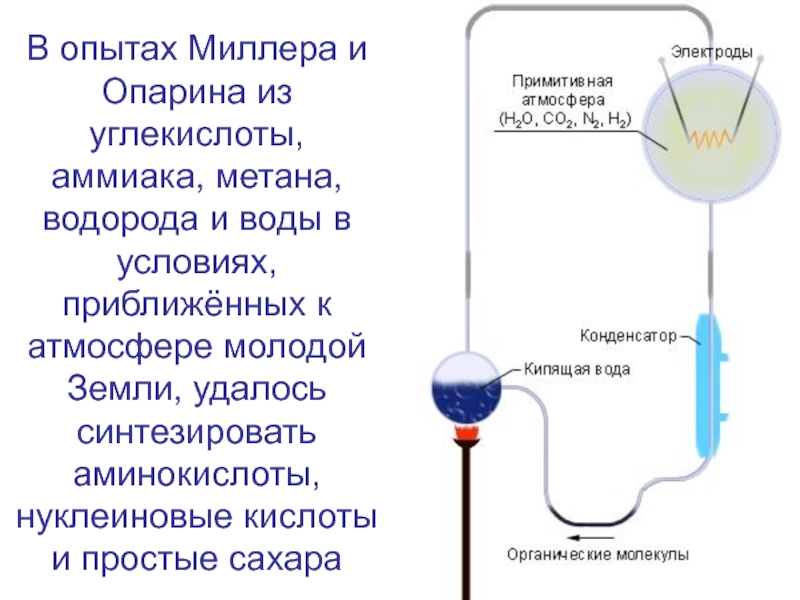 Слайд 15В опытах Миллера и Опарина из углекислоты, аммиака, метана, водорода