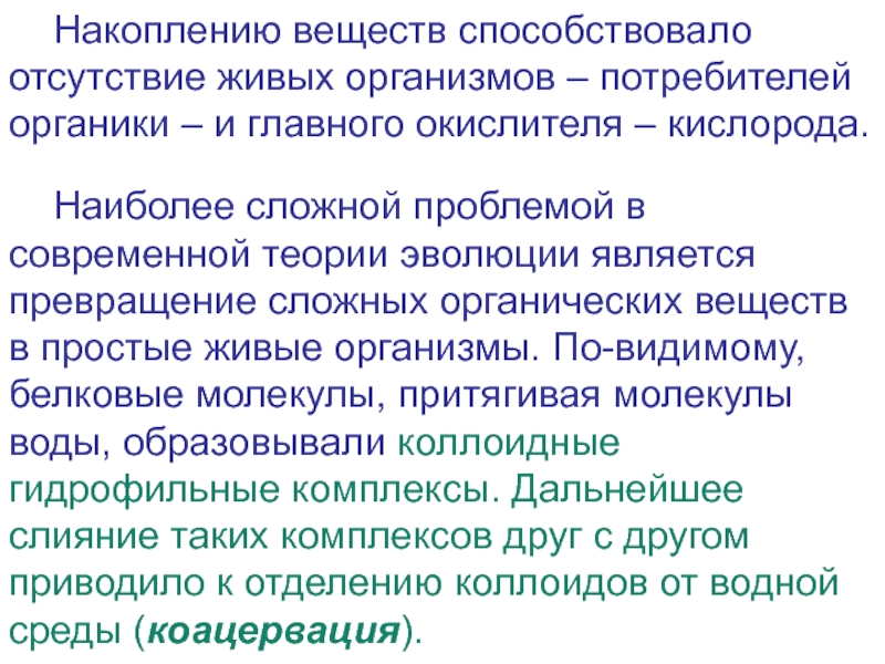 теории эволюции является превращение сложных органических веществ в простые живые организмы. По-видимому, белковые молекулы, притягивая молекулы воды, образовывали коллоидные гидрофильные комплексы. Дальнейшее слияние таких комплексов друг с другом приводило к отделению коллоидов от водной среды (коацервация).