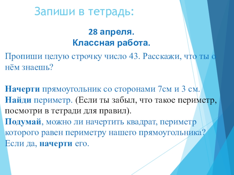 и 3 см. Найди периметр. (Если ты забыл, что такое периметр, посмотри в тетради для правил).