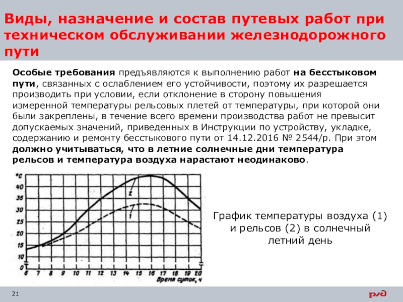 с ослаблением его устойчивости, поэтому их разрешается производить при условии, если отклонение в сторону повышения измеренной температуры рельсовых плетей от температуры, при которой они были закреплены, в течение всего времени производства работ не превысит допускаемых значений, приведенных в Инструкции по устройству, укладке, содержанию и ремонту бесстыкового пути от 14.12.2016 № 2544/р. При этом должно учитываться, что в летние солнечные дни температура рельсов и температура воздуха нарастают неодинаково.