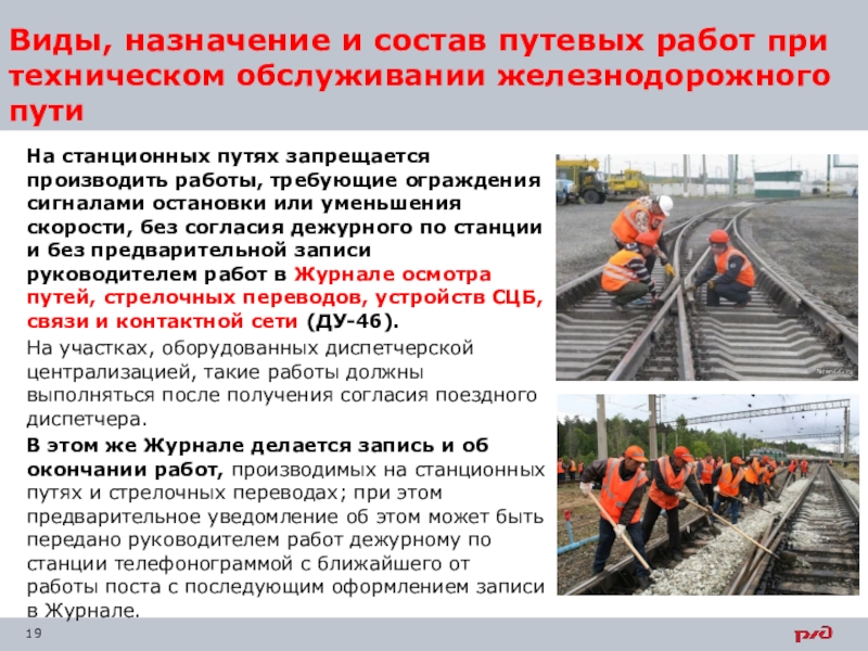 Слайд 19Виды, назначение и состав путевых работ при техническом обслуживании железнодорожного