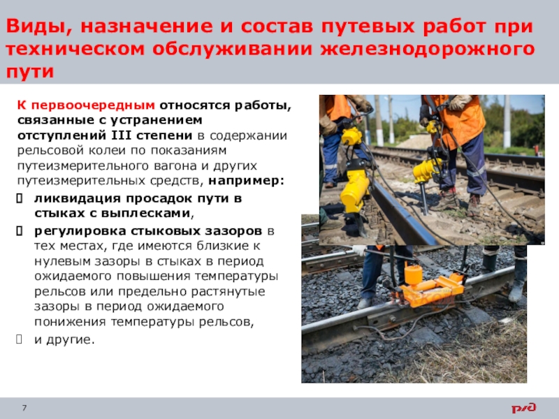 Слайд 7Виды, назначение и состав путевых работ при техническом обслуживании железнодорожного