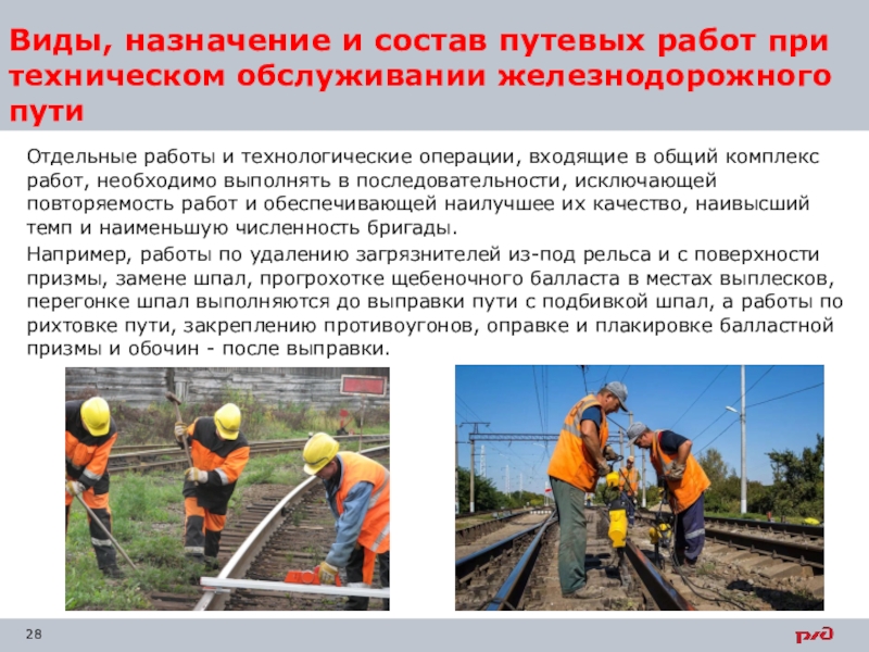 Слайд 28Виды, назначение и состав путевых работ при техническом обслуживании железнодорожного