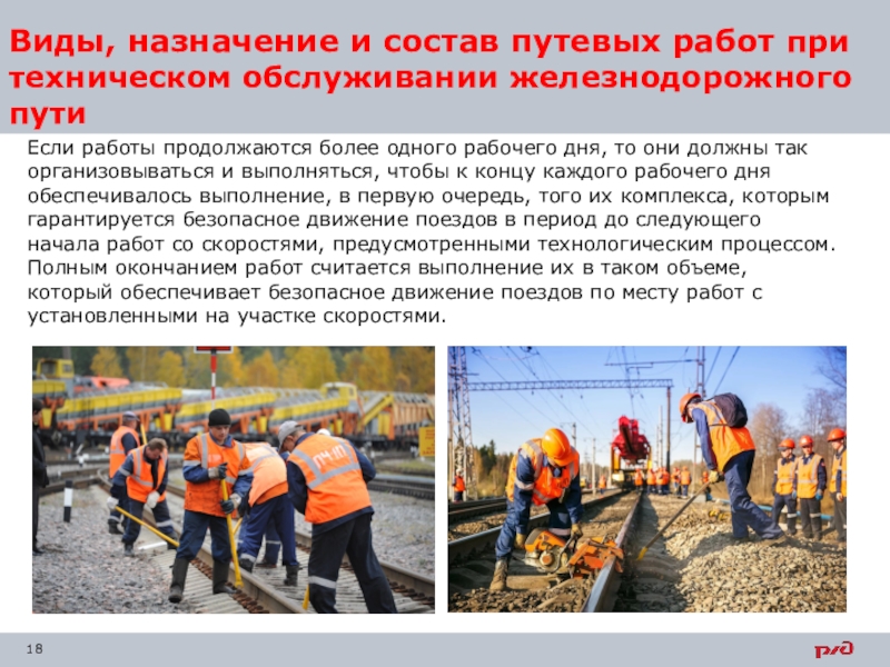 Слайд 18Виды, назначение и состав путевых работ при техническом обслуживании железнодорожного