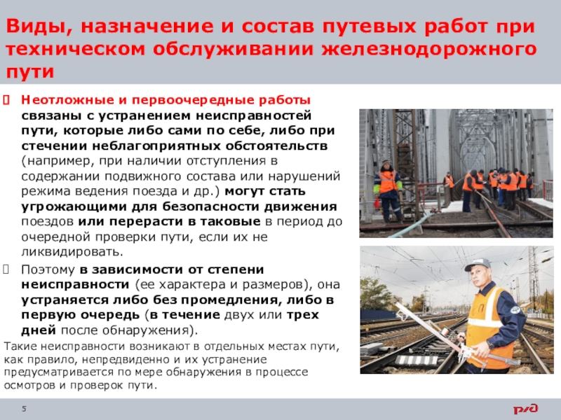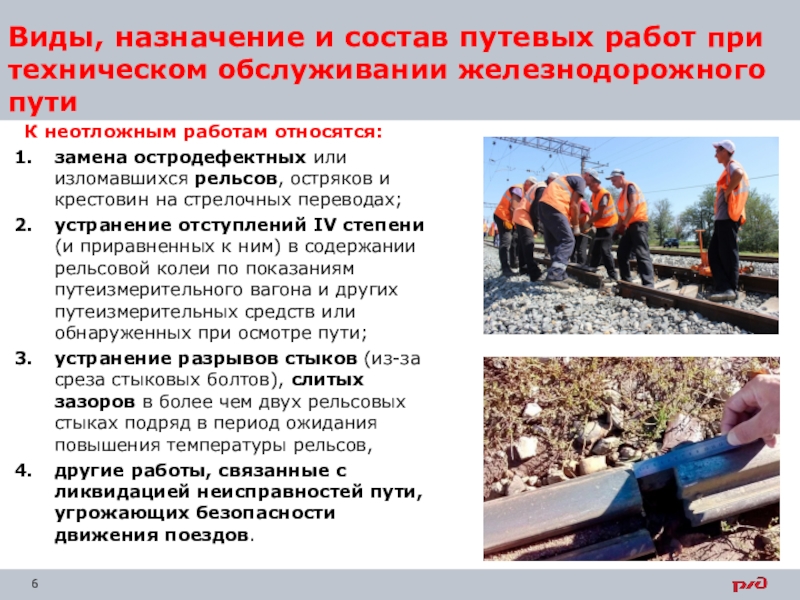 Неотложные и первоочередные работы связаны с устранением неисправностей пути, которые