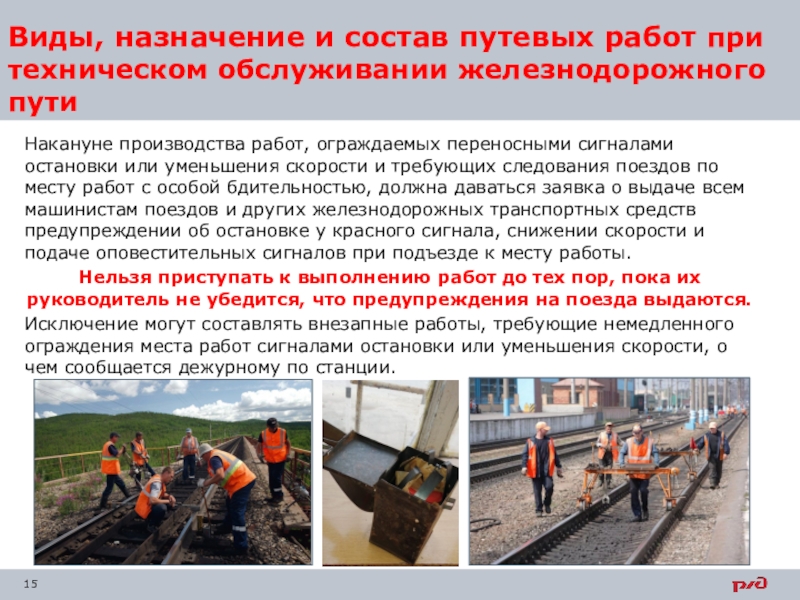 Слайд 15Виды, назначение и состав путевых работ при техническом обслуживании железнодорожного