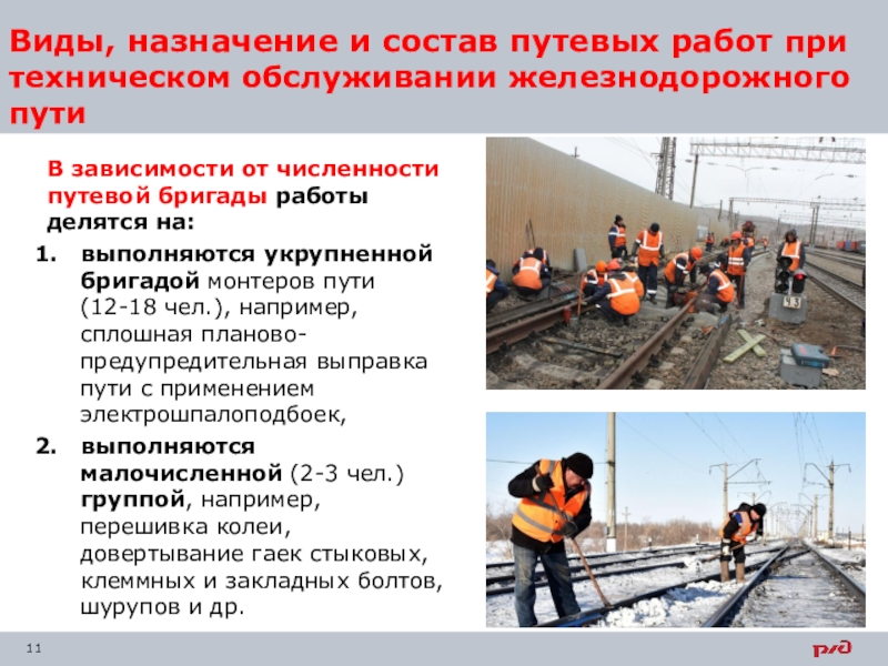 Слайд 11Виды, назначение и состав путевых работ при техническом обслуживании железнодорожного