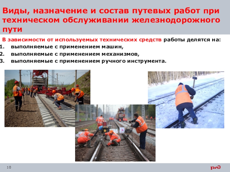 Слайд 10Виды, назначение и состав путевых работ при техническом обслуживании железнодорожного