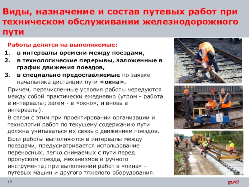Слайд 12Виды, назначение и состав путевых работ при техническом обслуживании железнодорожного
