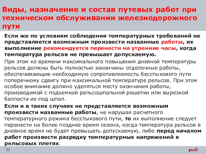 Слайд 22Виды, назначение и состав путевых работ при техническом обслуживании железнодорожного