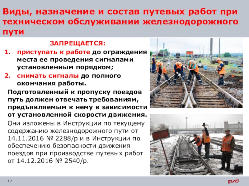 Они изложены в Инструкции по текущему содержанию железнодорожного пути от 14.11.2016 № 2288/р и в Инструкции по обеспечению безопасности движения поездов при производстве путевых работ от 14.12.2016 № 2540/р.