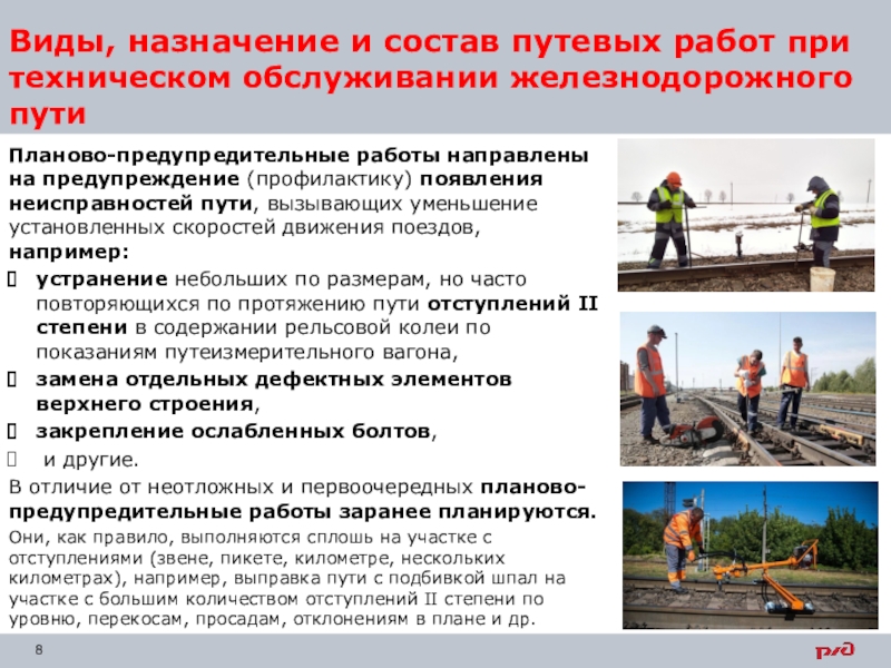 Слайд 8Виды, назначение и состав путевых работ при техническом обслуживании железнодорожного
