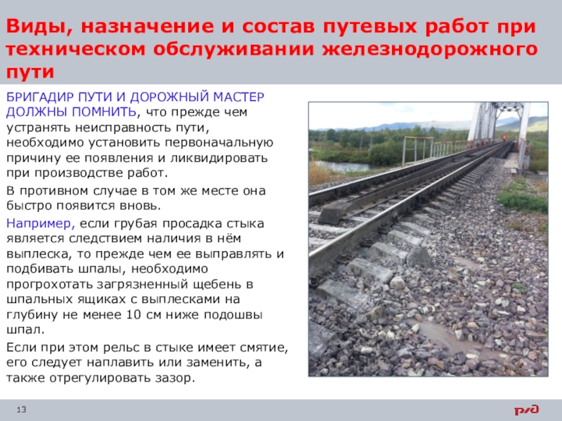 Слайд 13Виды, назначение и состав путевых работ при техническом обслуживании железнодорожного