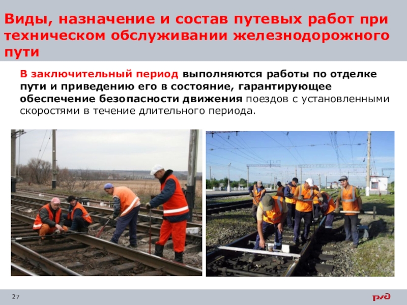 Слайд 27Виды, назначение и состав путевых работ при техническом обслуживании железнодорожного