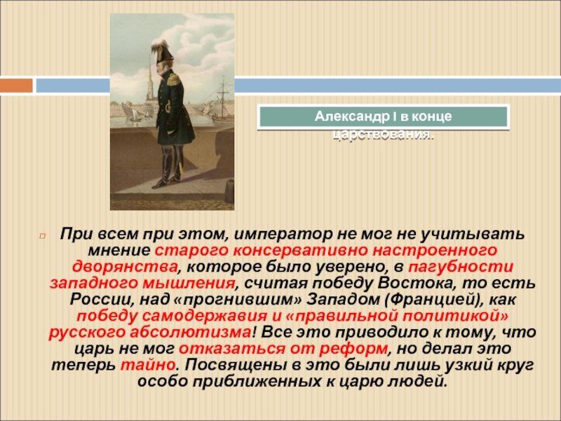 Сложность во внутренней политике и нерешенность всех насущных проблем, включая личные, наложили отпечаток на последние годы царствования императора. У Александра умирает сестра и две дочери. Царь страдает мистицизмом, верит в приметы, видя в пожаре Москвы и наводнении в Петербурге дурное предзнаменование. Царь ударяется в веру в бога, ездеет на богомолье и становится довольно странным.