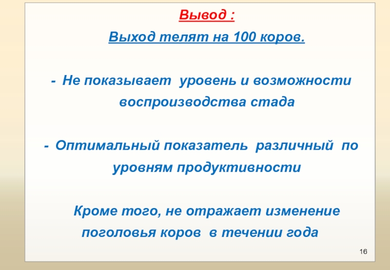 может достигается за счет наличия в стаде яловых, больных, низкопродуктивных коров, что неизбежно приведет к ухудшению результатов работы отрасли, при этом снижается эффективность использования бюджетных средств.