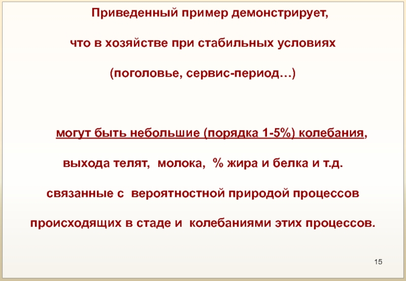 Это обстоятельство приводит к тому, что даже при стабильной ситуации в стаде, мы будем видеть различные экономические показатели работы отрасли, например, по годам.