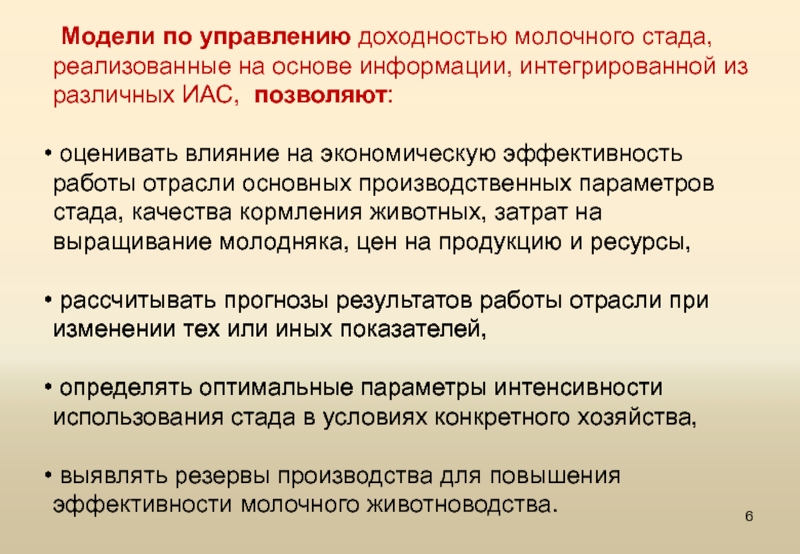 Слайд 6 Модели по управлению доходностью молочного стада, реализованные на основе информации,
