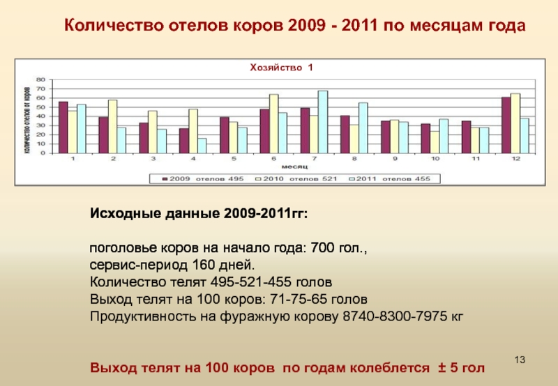 Слайд 13Количество отелов коров 2009 - 2011 по месяцам года