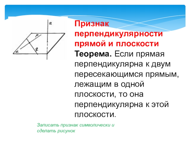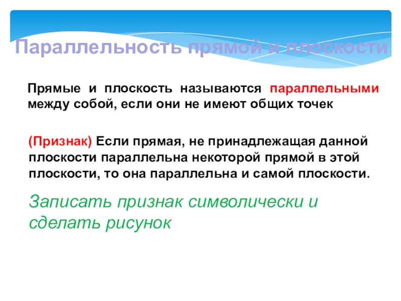 данной плоскости параллельна некоторой прямой в этой плоскости, то она параллельна и самой плоскости.Записать признак символически и сделать рисунок