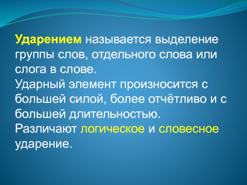 Слайд 2Ударением называется выделение группы слов, отдельного слова или слога в слове.