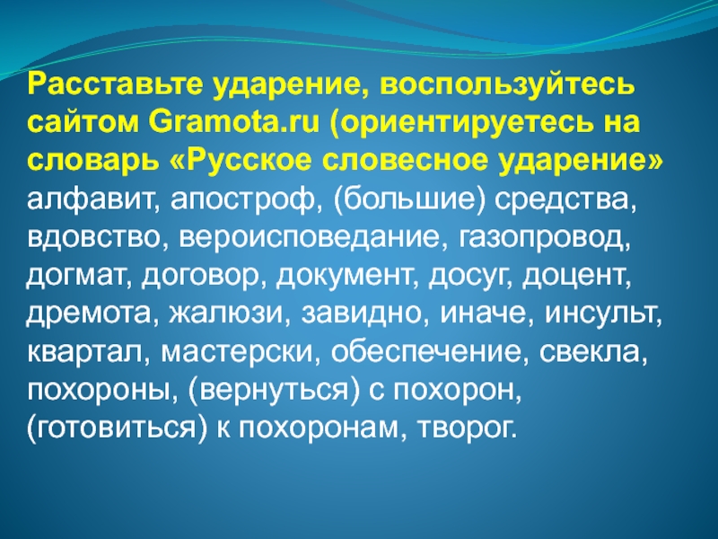 Слайд 15Расставьте ударение, воспользуйтесь сайтом Gramota.ru (ориентируетесь на словарь «Русское словесное
