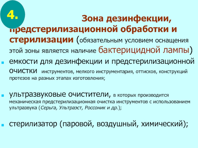 3. Для обеспечения чистоты воздуха и уничтожения микроорганизмов в кабинете должны быть установлены ультрафиолетовые бактерицидные лампы, бактерицидные облучатели (рециркуляторы).