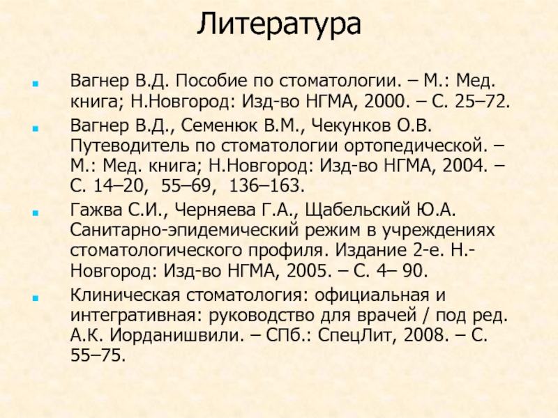 Вагнер В.Д. Пособие по стоматологии. – М.: Мед. книга; Н.Новгород: