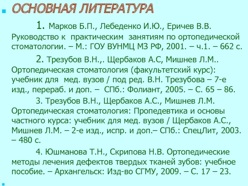 3. Трезубов В.Н., Щербаков А.С., Мишнев Л.М. Ортопедическая стоматология: Пропедевтика и основы частного курса: учебник для мед. вузов / Щербаков А.С., Мишнев Л.М. – 2-е изд., испр. и доп.– СПб.: СпецЛит, 2003. – 480 с.