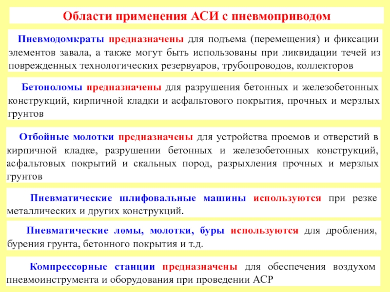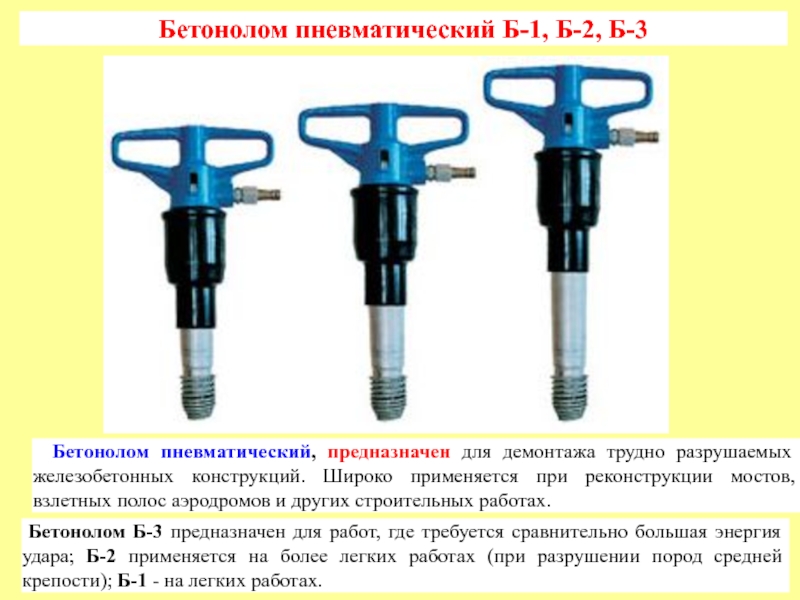 Пневматические ломы, молотки, буры используются для дробления, бурения грунта, бетонного покрытия и т.д.