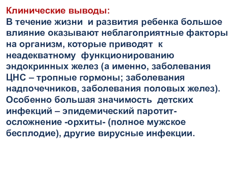Особенно большая значимость детских инфекций – эпидемический паротит-осложнение -орхиты- (полное мужское бесплодие), другие вирусные инфекции.