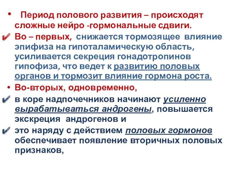 Слайд 13Период полового развития – происходят сложные нейро гормональные сдвиги -