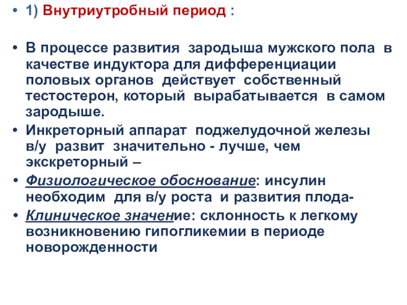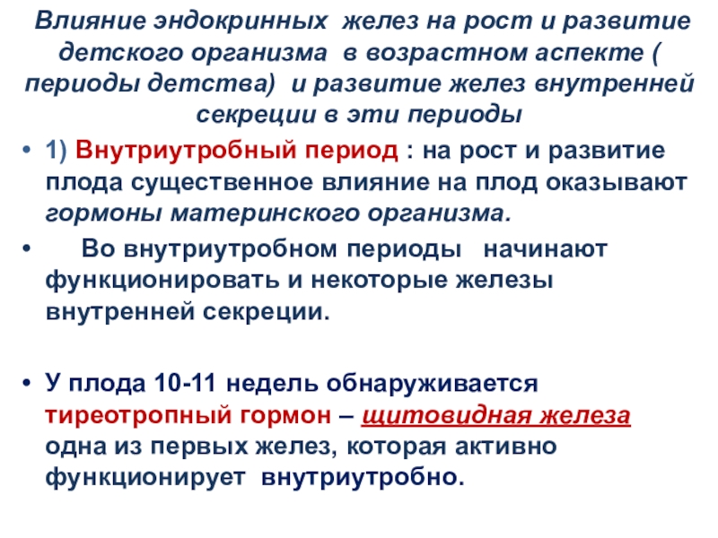 1) Внутриутробный период : на рост и развитие плода существенное влияние на плод оказывают гормоны материнского организма.