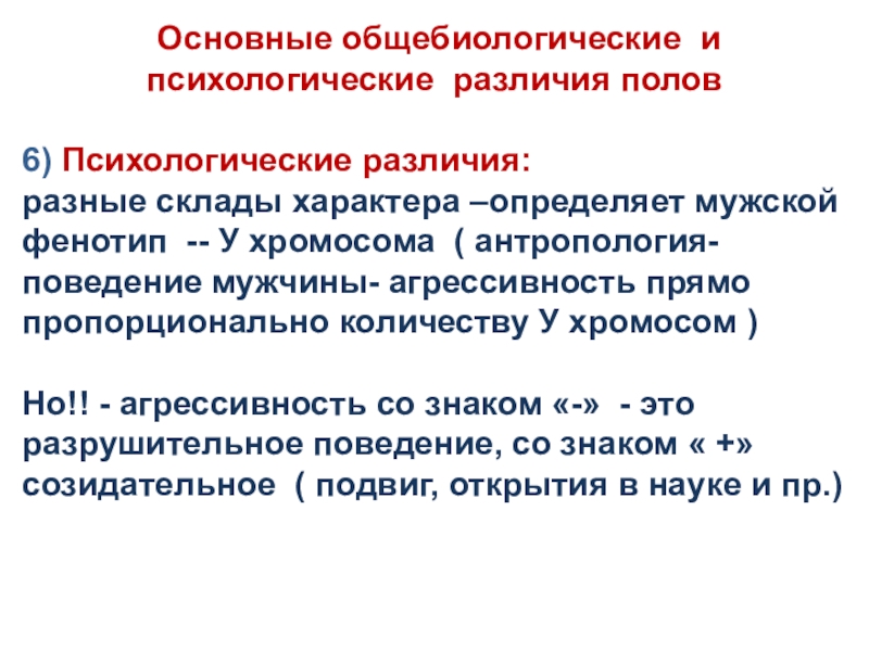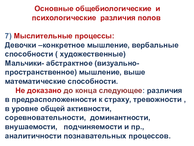 Не доказано до конца следующее: различия в предрасположенности к страху, тревожности , в уровне общей активности, соревновательности, доминантности, внушаемости, подчиняемости и пр., аналитичности познавательных процессов.