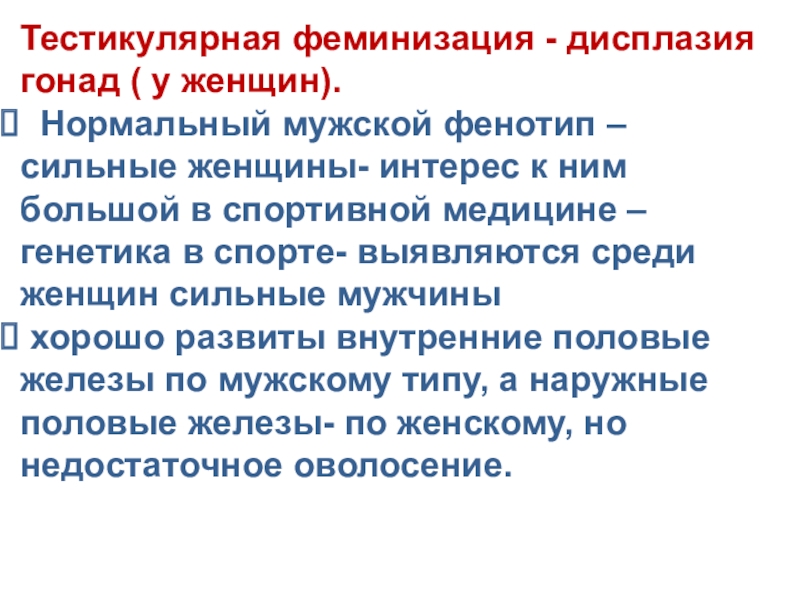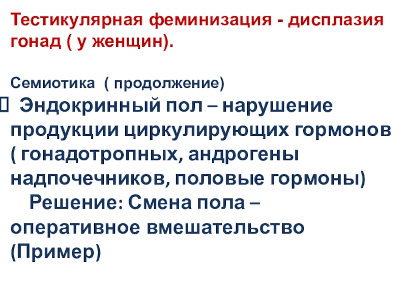 Слайд 63Тестикулярная феминизация - дисплазия гонад ( у женщин).