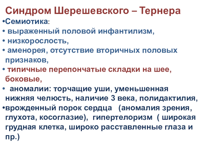 врожденный порок сердца (аномалия зрения, глухота, косоглазие), гипертелоризм ( широкая грудная клетка, широко расставленные глаза и пр.)