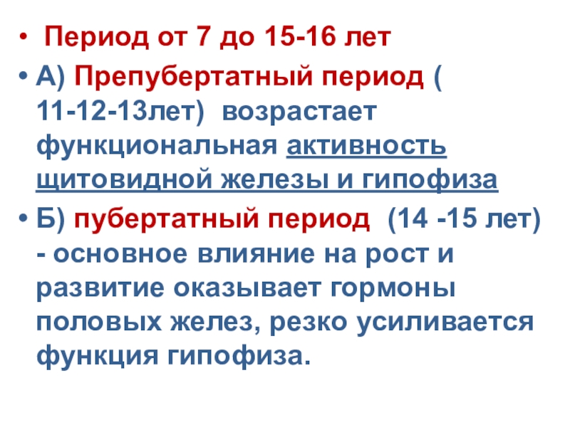период (14 -15 лет) - основное влияние на рост и развитие оказывает гормоны половых желез, резко усиливается функция гипофиза.