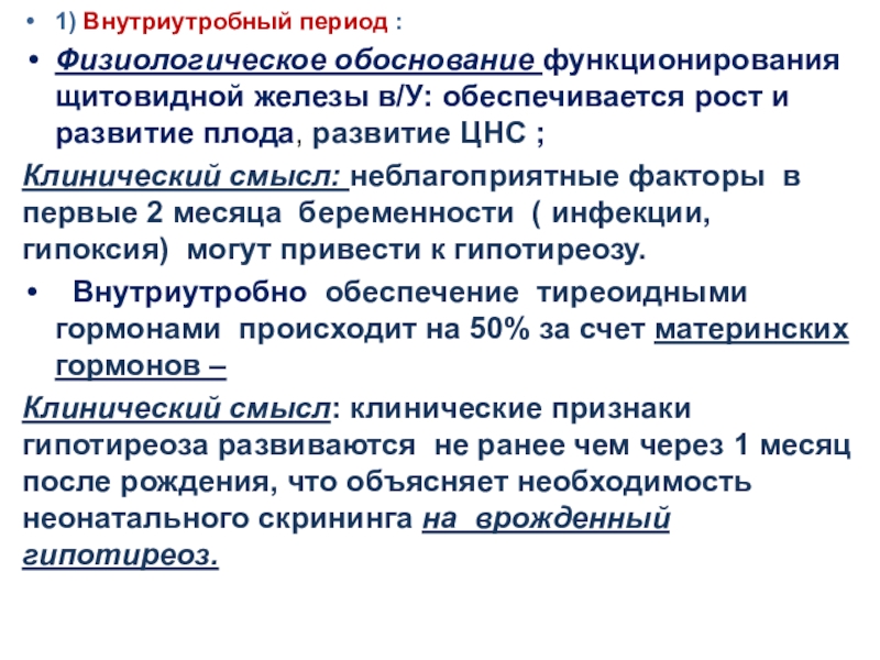 Клинический смысл: клинические признаки гипотиреоза развиваются не ранее чем через 1 месяц после рождения, что объясняет необходимость неонатального скрининга на врожденный гипотиреоз.