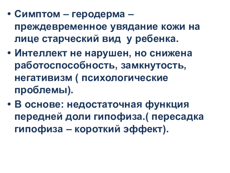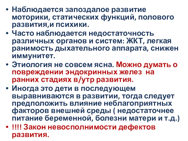 Частая патология: патология со стороны гипофиза – нанизм, гигантизм, нарушение полового созревания (отставание или преждевременное) и пр.