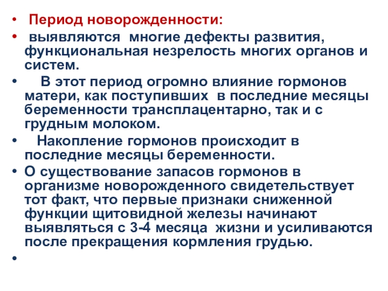 О существование запасов гормонов в организме новорожденного свидетельствует тот факт, что первые признаки сниженной функции щитовидной железы начинают выявляться с 3-4 месяца жизни и усиливаются после прекращения кормления грудью.