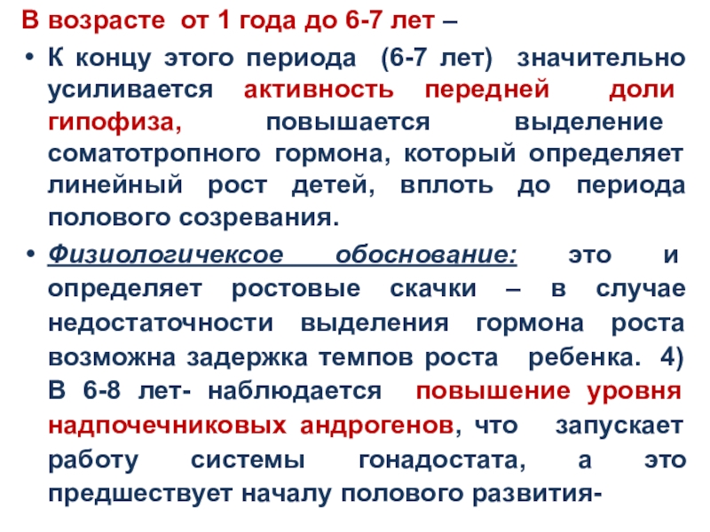 Физиологичексое обоснование: это и определяет ростовые скачки – в случае недостаточности выделения гормона роста возможна задержка темпов роста ребенка. 4) В 6-8 лет- наблюдается повышение уровня надпочечниковых андрогенов, что запускает работу системы гонадостата, а это предшествует началу полового развития-