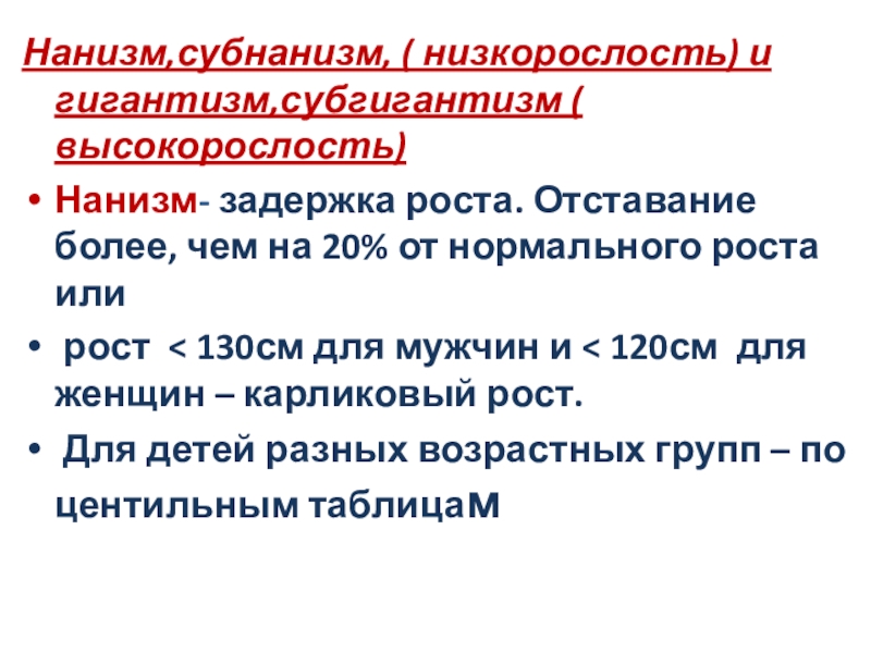 Слайд 16Нанизм,субнанизм, ( низкорослость) и гигантизм,субгигантизм ( высокорослость)
