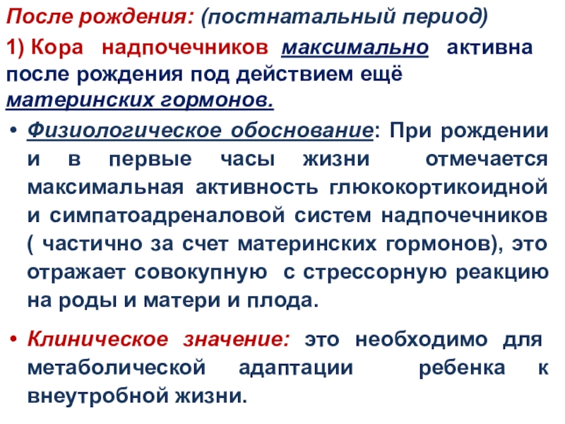 рождении и в первые часы жизни отмечается максимальная активность глюкокортикоидной и симпатоадреналовой систем надпочечников ( частично за счет материнских гормонов), это отражает совокупную с стрессорную реакцию на роды и матери и плода.